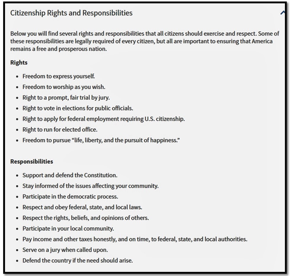And I am a good citizen, at least according to this “Citizenship Rights and Responsibilities” list on the USCIS website: