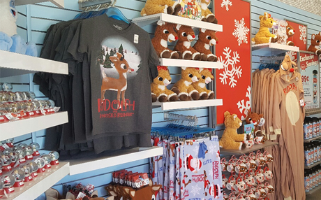 “If you can’t get enough of everyone’s favorite reindeer, stop by the Holly Jolly Marketplace, a special boutique here for the season with a fun-filled collection of Rudolph the Red-Nosed Reindeer gifts, apparel and keepsakes.”