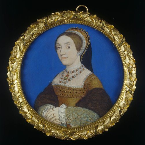 Weir suggests these miniatures “can be identified on good grounds as Katheryn.” Left: “Portrait of a Lady, Perhaps Katherine Howard” in the Royal Collection Trust, by Hans Holbein, painted c. 1540. Right: “Portrait Miniature of Katherine Howard” by Hans Holbein, painted c. 1540, Buccleuch Collection.