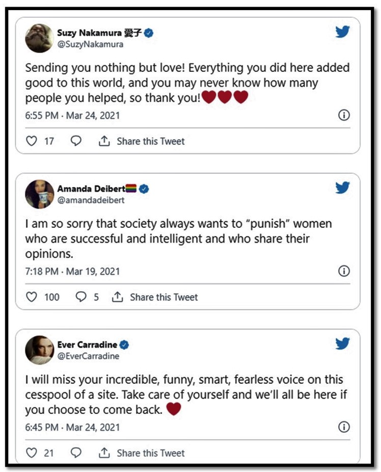 And her 13.7 million former Twitter followers? If these examples are anything to go by, they are bereft: