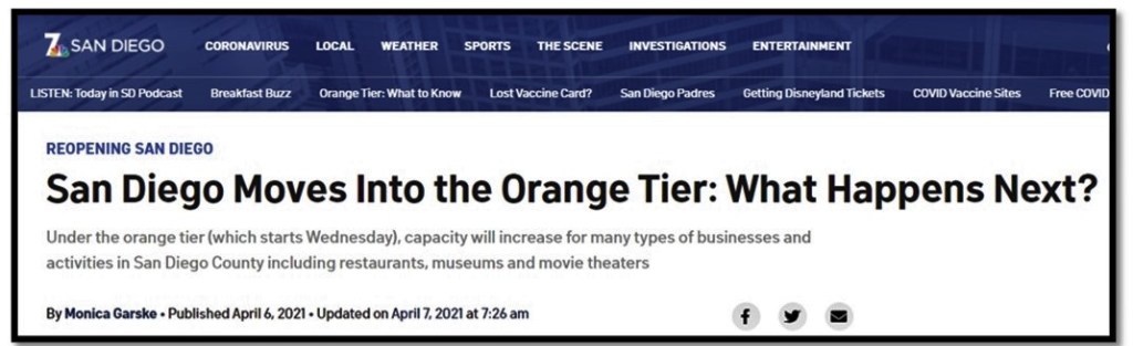 And that on May 7 – after what seems like forever – San Diego County moved from the red tier to orange: