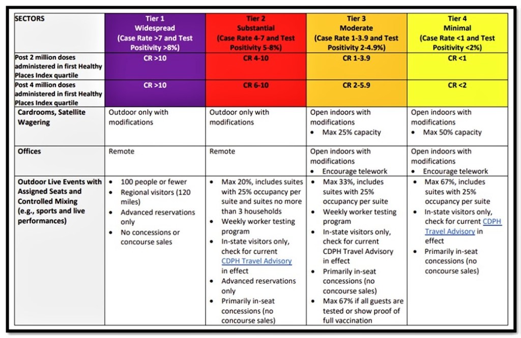 For what seems like forever, California has had a tiered, color-coded plan for safely reopening counties during the coronavirus pandemic – see image above.