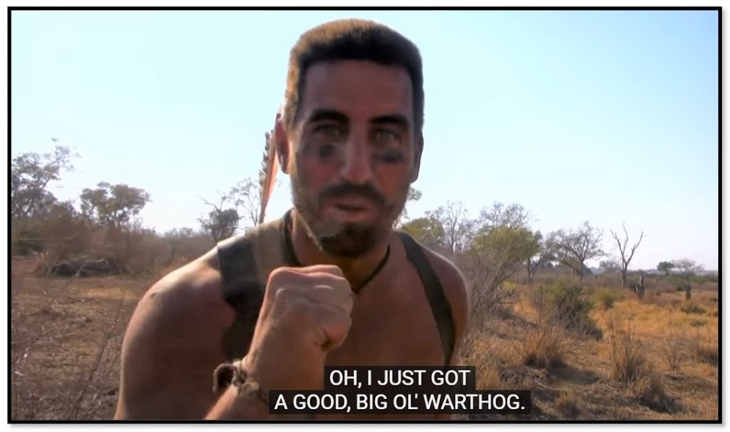 “Elite survivalist Matt Wright manages to catch a warthog to bring back to camp in Africa.”