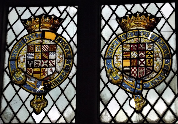 The image on the left features three lions and two chevrons on a shield, below a gloved hand gripping an arrow.