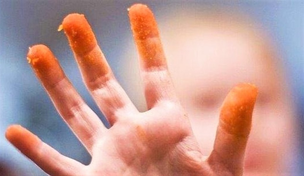 If you’re not a Cheetos consumer, you may be wondering about the phrase “the brand’s orange dust.” Cheetos are a finger food, and the orange dust is a powdery substance that sticks to your fingers, making them look like this:
