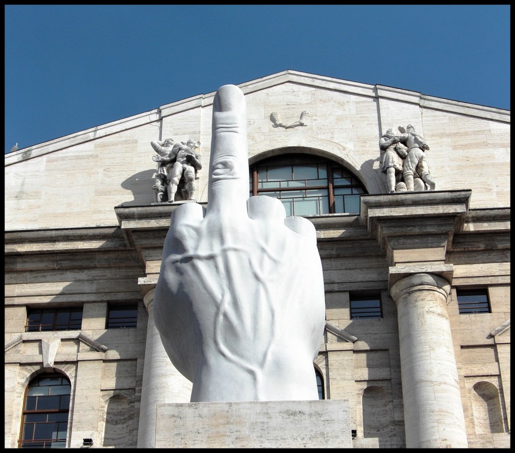 My giant hand statue is currently on loan to Milan, Italy where it resides in the Piazza Affari, the square in Milan where the Italian stock exchange has its headquarters.