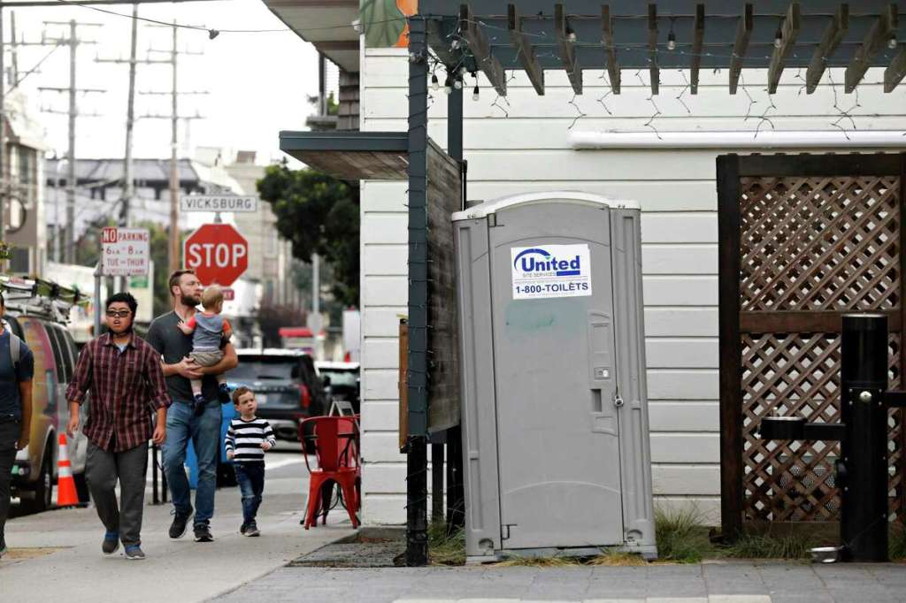 “…at the Noe Valley Town Square, a ratty Porta Potti leans in the corner, unlocked only on Saturdays for farmers’ market vendors.”