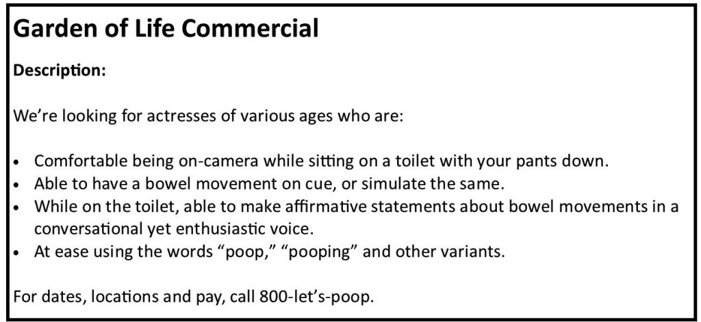 It’s almost as if the advertising agency who created this commercial did two separate commercials and spliced them together. One for Garden of Life, and the other – some sort of video manifesto about being not just a woman, but a proudly pooping woman.