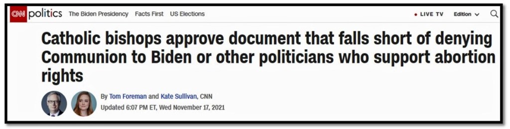 “The US Conference of Catholic Bishops voted overwhelmingly Wednesday to approve a document that fell far short of refusing Holy Communion to President Joe Biden or others who support abortion rights, something conservatives in the Church have pushed for in spite of guidance from Pope Francis.