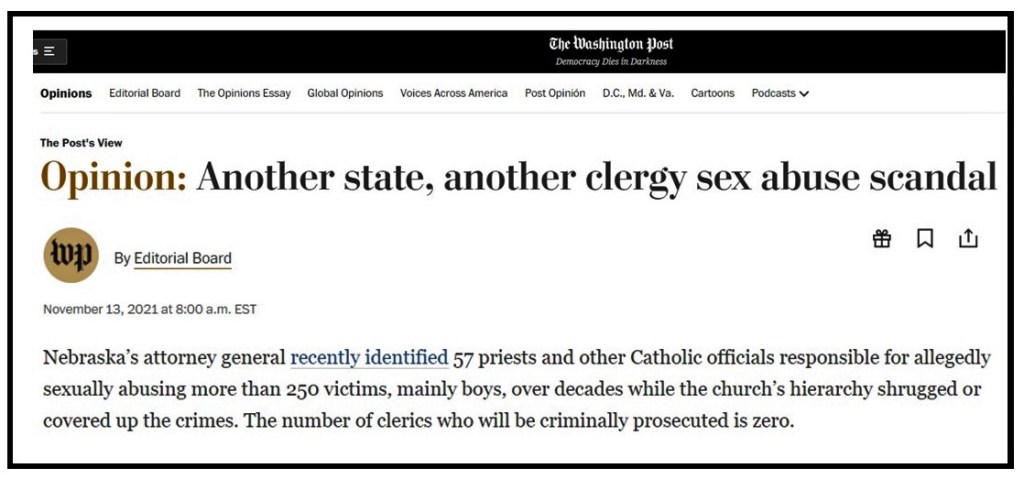 Isn’t it interesting that when Archbishop Cordileone was citing the “grave evils” of society – “human trafficking, racism, terrorism, climate change and a flawed immigration system” – it didn’t occur to him to include the global crisis of clergy sexual abuse?